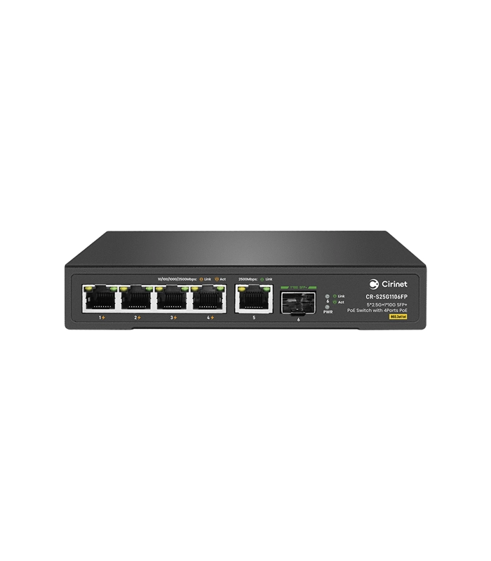 1-4 პორტიანი სვიჩი Cirinet CR-S25G1106FP 5*2.5G + 1*10G SFP+ უმართავი დესკტოპის PoE სვიჩი 4Ports PoE-ით, WiFi 6/6E როუტერი